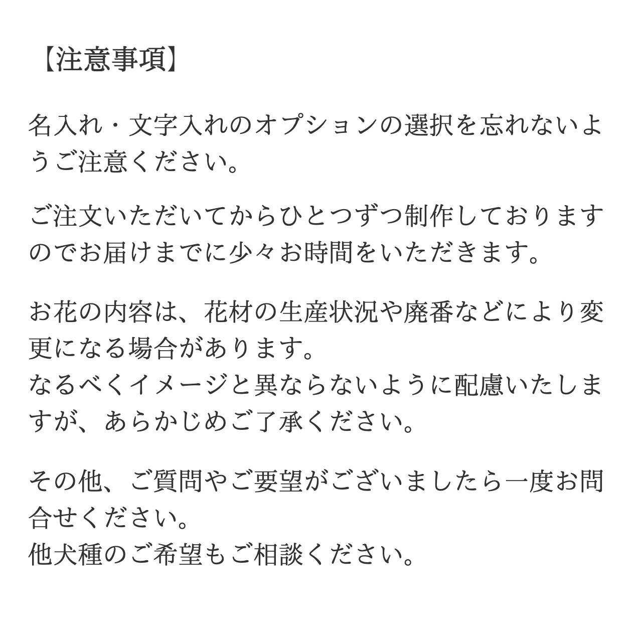 「シルエット犬種名」「希望カラー」「愛犬のお名前」「文字入れ内容」を記載の上