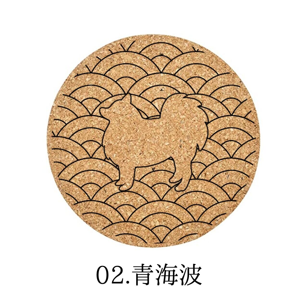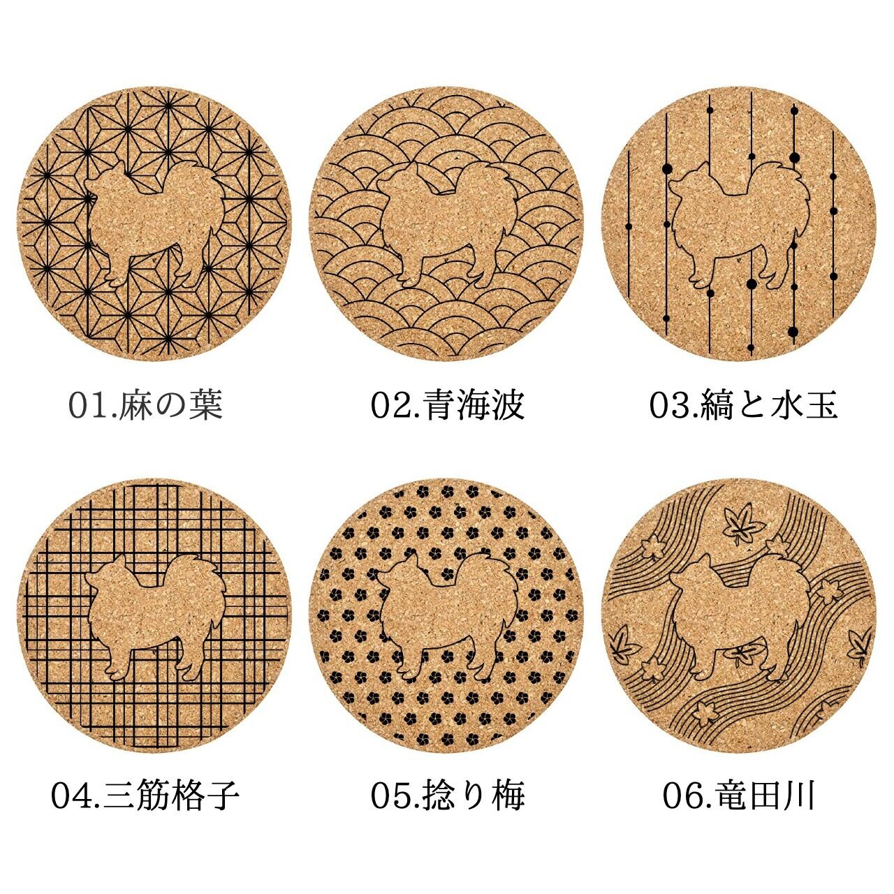 日本の伝統文様と、日本原産犬種の日本スピッツのシルエットを組み合わせたおしゃれなコルクコースターです。