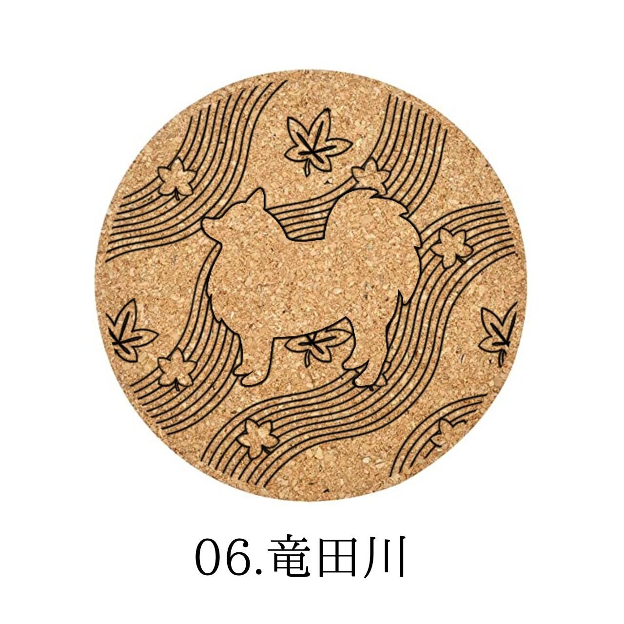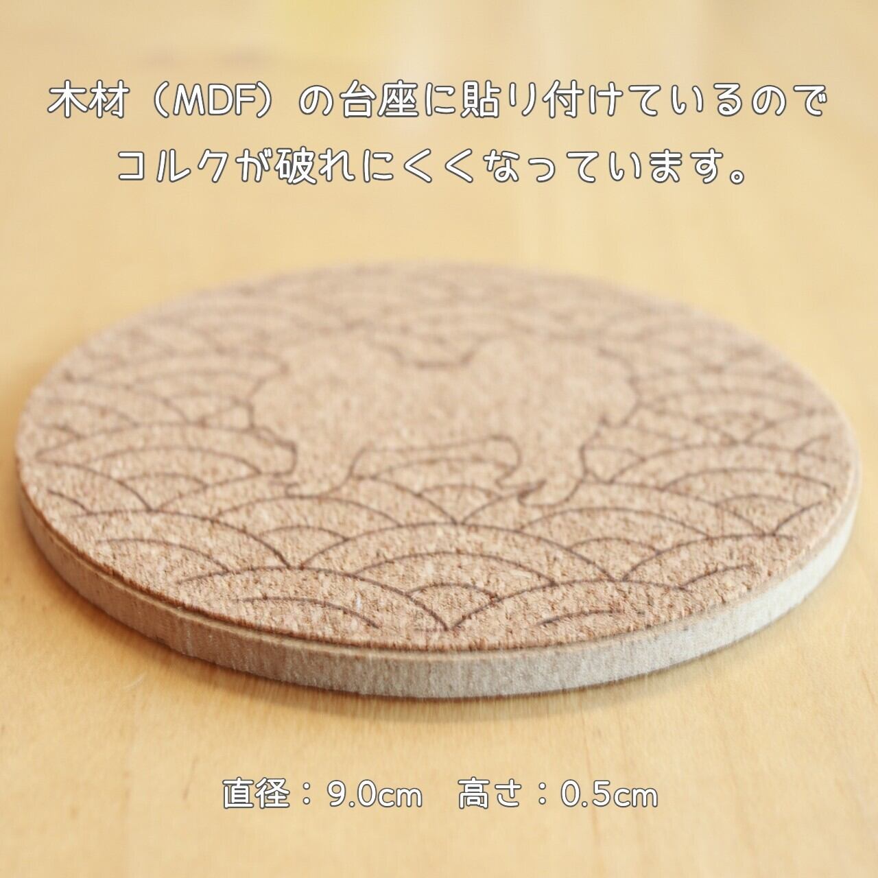 日本の伝統文様と、日本原産犬種の日本スピッツのシルエットを組み合わせたおしゃれなコルクコースターです。