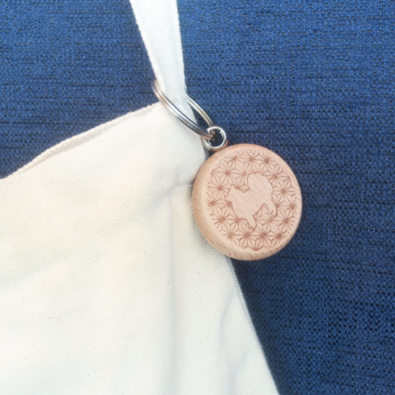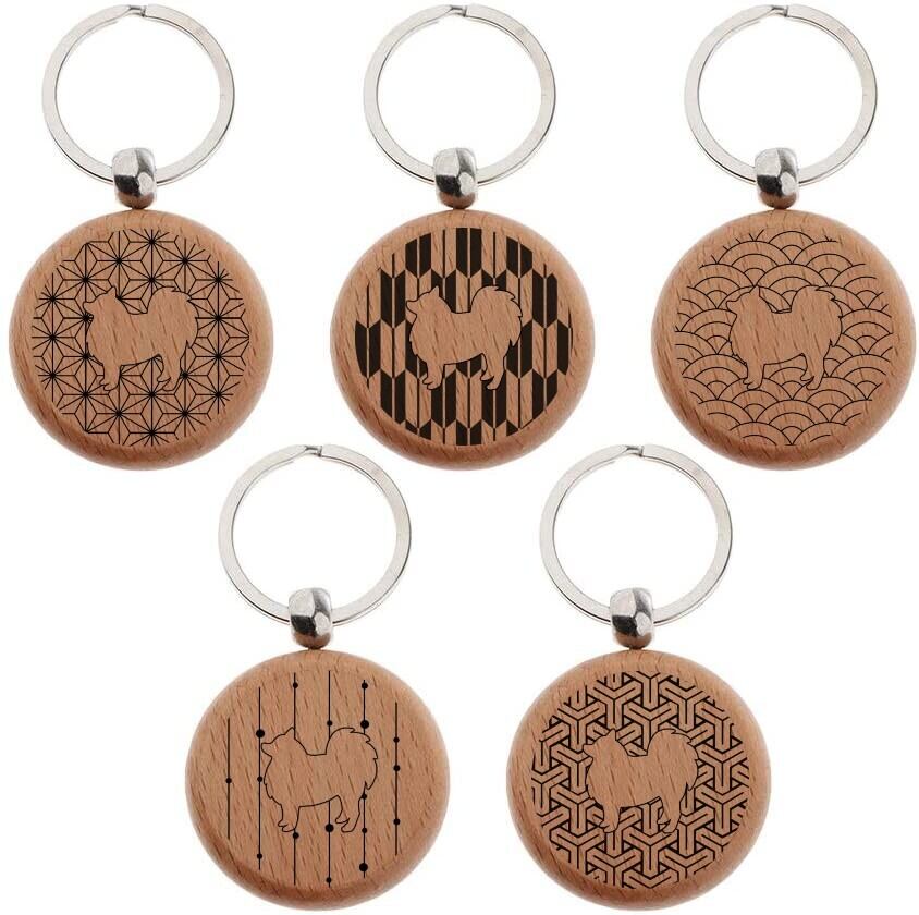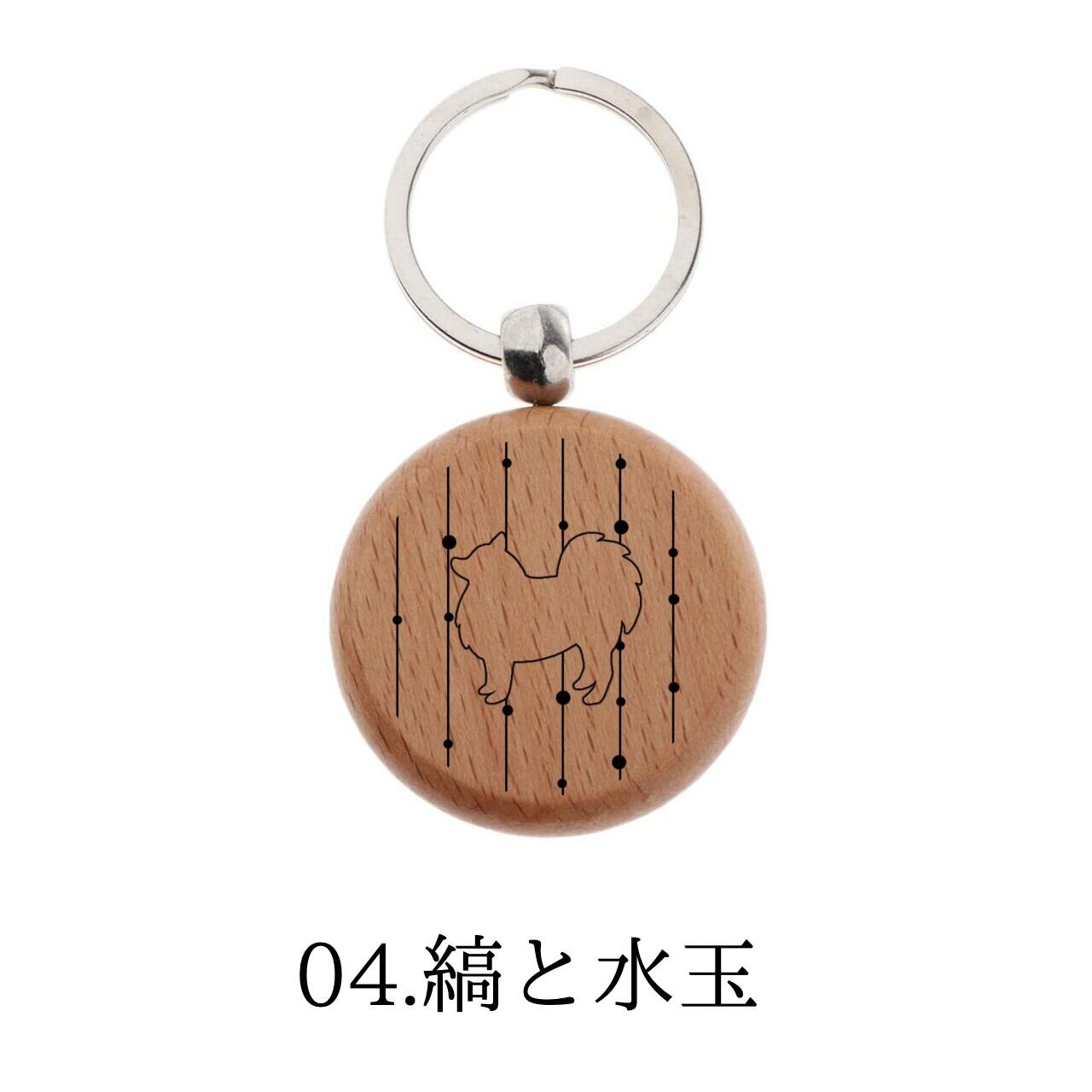 日本スピッツのシルエットと日本の伝統文様(和柄)を組み合わせた木製の円形キーホルダーです。