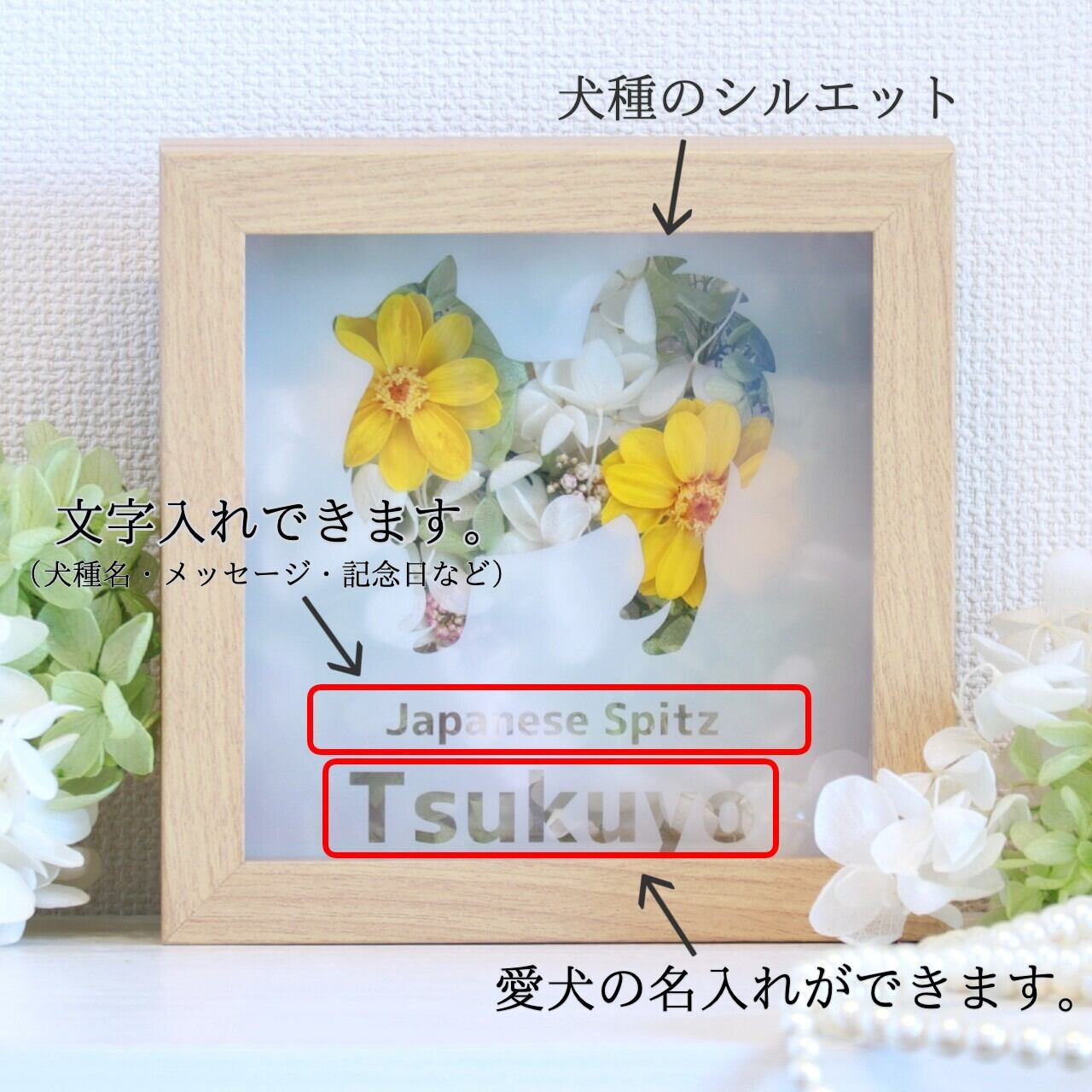 「シルエット犬種名」「希望カラー」「愛犬のお名前」「文字入れ内容」を記載の上