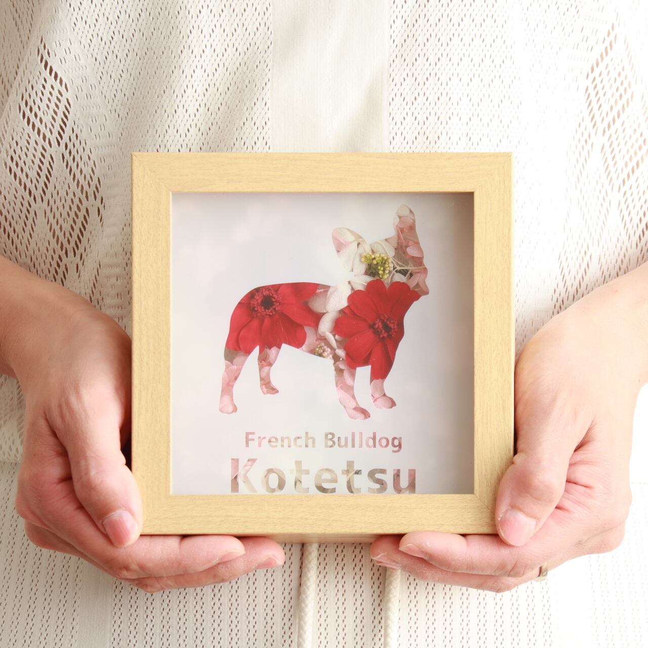 フレンチブルドッグのシルエットのうしろから彩りあざやかなお花が透けるインテリアフレームです。