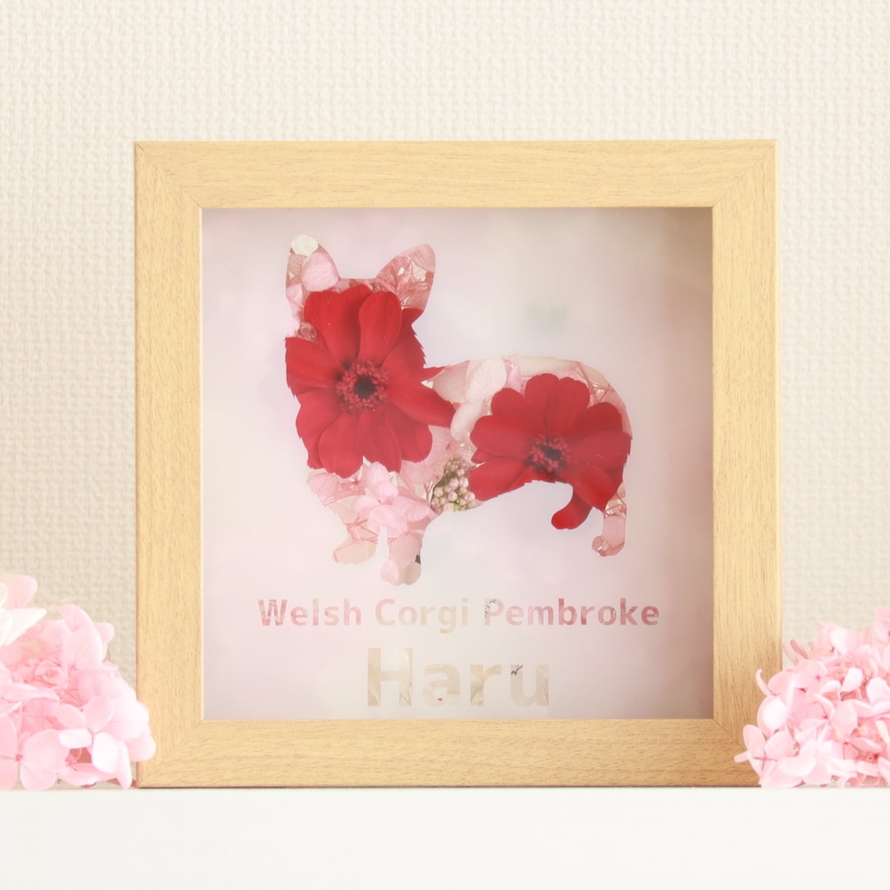 コーギーのシルエットのうしろから彩りあざやかなお花が透けるインテリアフレームです。