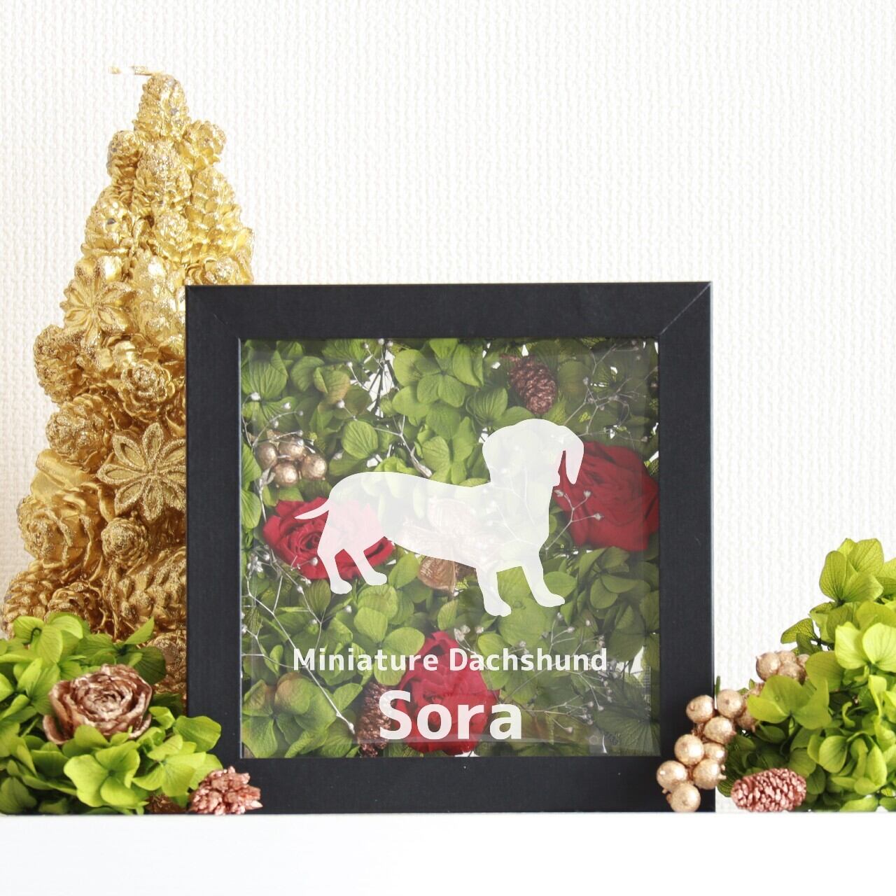 《クリスマス特別バージョン2025》犬シルエットとプリザーブドフラワーの木製ガラスフレーム 愛犬の名入れ・文字入れ◎
